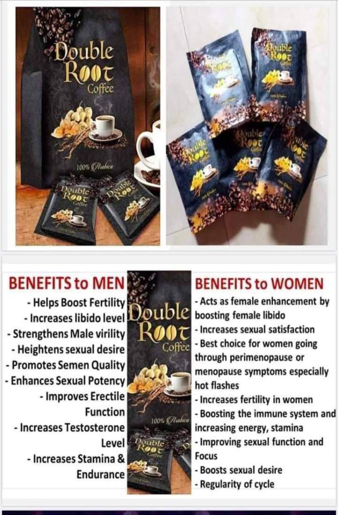 Double Root Coffee is 100% Natural, 100% Vegetarian and is a combination of THREE powerful all-natural and organic herbs with 100% Arabica coffee beans, that could make you a real man again since Erectile dysfunction (ED), or impotence, is a major challenge for many men today regardless of their age — young, middle-aged, or old. The ingredents contained in Double Root Coffee are; Arabica Coffee Powder Non-dairy creamer Sucralose EnduranceTongkat Ali – Eurycoma longifolia, also known as Malaysian ginseng or tongkat ali, is a therapeutic herb native to the Malaysian rain forests. Maca – Known by its scientific name, Lepidium meyenii, maca is a type of cruciferous vegetable native to the Andes of Peru.It has been used medicinally for thousands of years and has been shown to enhance sexual health and libido; improve energy, mood and memory; and balance hormone levels. Ashwagandha: Ashwagandha, one of the most powerful herbs in Ayurvedic healing, has been used since ancient times for a wide variety of conditions. It is most well-known for its restorative and rejuvenating benefits. Researchers have found that it may be a natural herbal alternative treatment for loss of libido and erectile dysfunction. BENEFITS of DOUBLE ROOT COFFEE to MEN Helps Boost Fertility. Increases libido level. Heightens sexual desire. Promotes Semen Quality. Improves Erectile Function. Increases Testosterone Level. Increases Stamina & Endurance. USAGE DESCRIPTION: 1 Sachet Once a Week. But if taking one whole Sachet causes HeadAche for you, then you should take Half of it, and the remaining half after 2 days. Then you can take another one after 5 days of taking the 2nd half.And keep taking it half, each time. If no headache caused, you can keep taking a whole Sachet once per week.